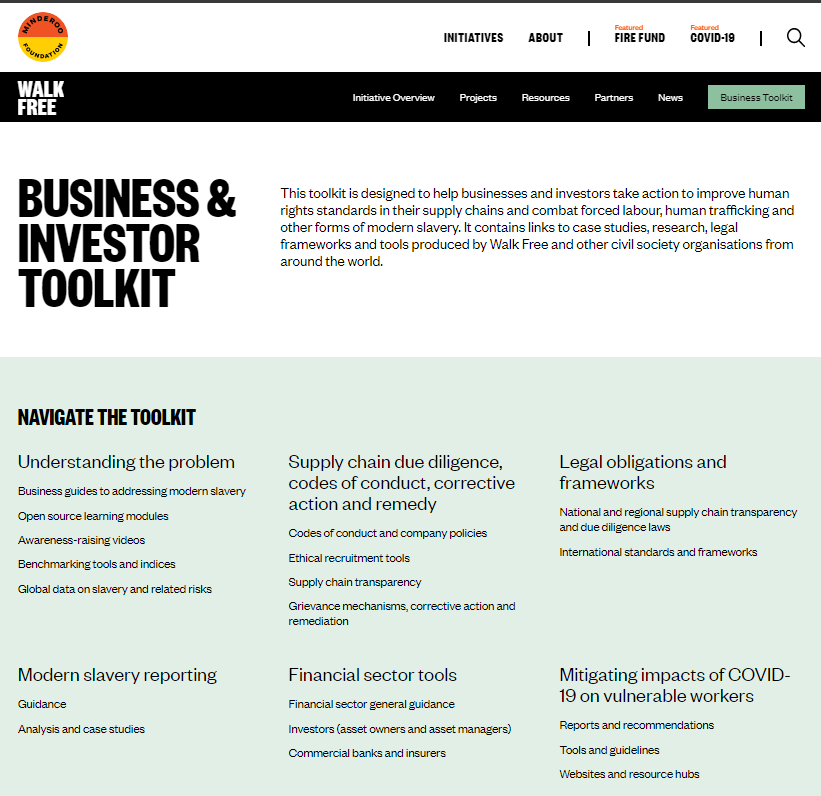 How can it help? – This toolkit is designed to help businesses and investors take action to improve human rights standards in their supply chains and combat forced labour, human trafficking and other forms of modern slavery. It contains links to case studies, research, legal frameworks and tools produced by Walk Free and other civil society organisations from around the world.